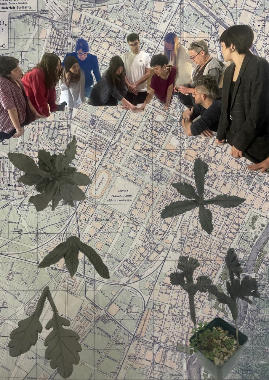 L’artista, avvalendosi della collaborazione con la Facoltà di Scienze Ambientali di Sapienza Università di Roma, è entrata in contatto con l’Erbario dell’Università di Torino per accedere ai fogli di censimento, alle schede e da queste, partendo dalla fine Settecento, ricostruire i luoghi di fioritura nella città passata, creando un inventario della memoria del naturale urbano da implementare attraverso il vissuto dei partecipanti al workshop.